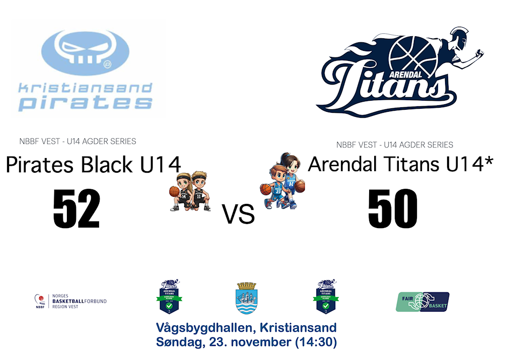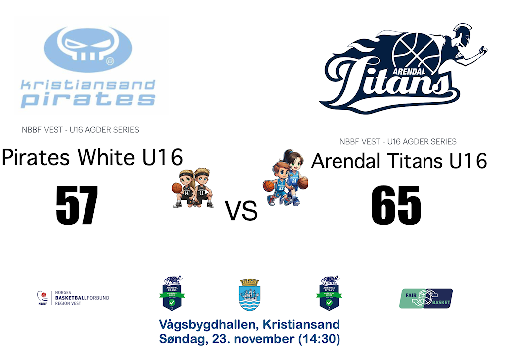 Vårt U16-lag spiller sin andre kamp mot Kristiansand Pirates Hvite U16. Den første kampen mellom lagene endte med en klar seier på 68-33 til Titans.