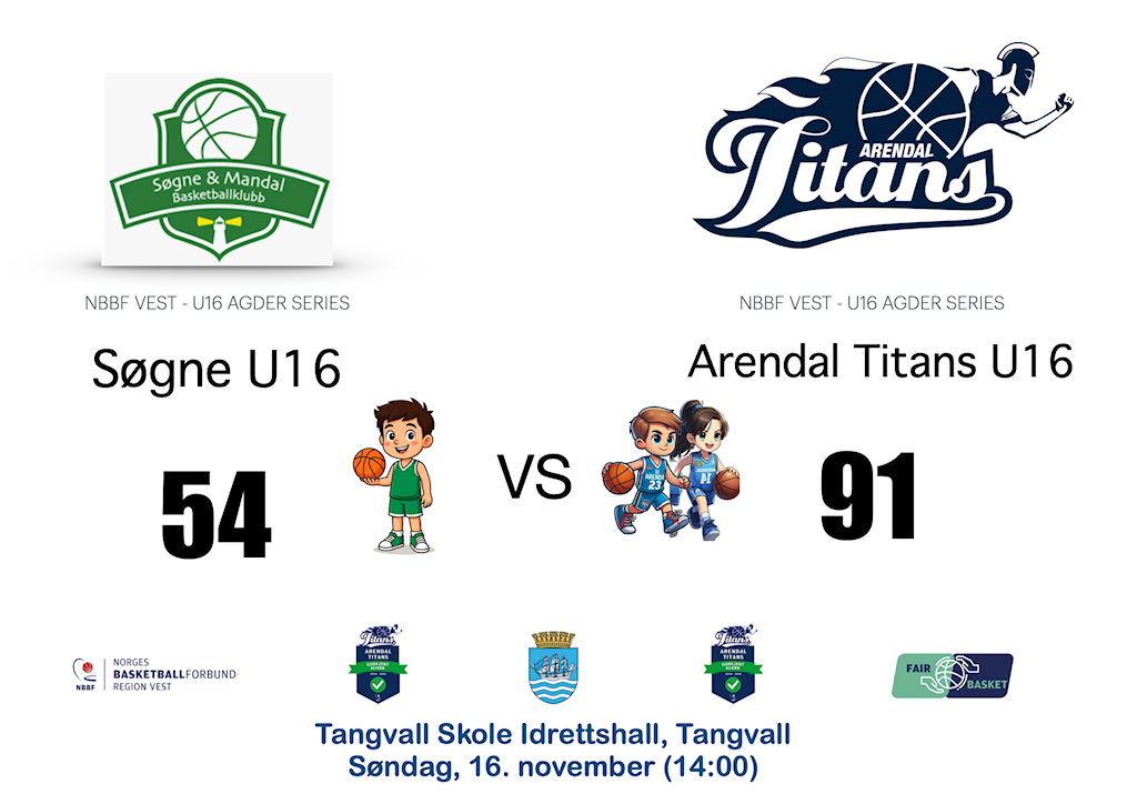 Etter en påminnelse fra trener Jesse Lee Krombel om hvilket forsvarsspill vi står for, skjerpet laget seg totalt. Fra det øyeblikket kom aldri Søgne U16 laget i nærheten. Arendal Titans U16 tok fullstendig kontroll og sikret en suveren seier til slutt med 54 - 91!