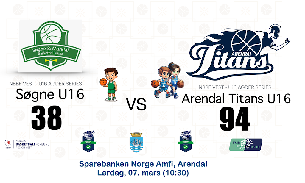 Med bare seks spillere reiste et sammensveiset Titans-lag til Søgne. Det de manglet i antall, veide de opp for med hjerte og pågangsmot. Gutta og jentene kontrollerte kampen fra start til slutt, og viste en imponerende laginnsats som aldri ga seg. Etter å ha vunnet hver periode, kunne de til slutt juble for en overlegen 94-38 seier.